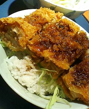ご飯の上にキャベツとチキンカツがのっていてソース味です。