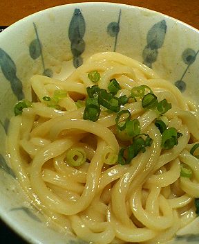 釜揚げ、つまり温かいツユなしのうどんにバターと濃い目のツユ(のもと?)を絡めてあります。(要するにバター醤油ですね)