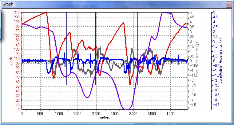 このグラフでは赤:スピード 青:縦G 灰:横G 紫:高低差となります。